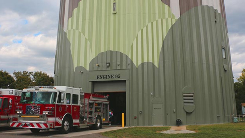 Station 95 is located within a water tower and is only one of four such fire stations in the nation known to co-locate in a water storage facility. The location is a joint partnership between the City of Columbus, who operates the 1 million gallon water facility, City of Dublin who owns the tower and the land, and Washington Township, who leases the tower column for the fire station. The bay is on the ground level and living quarters are above the bay.
